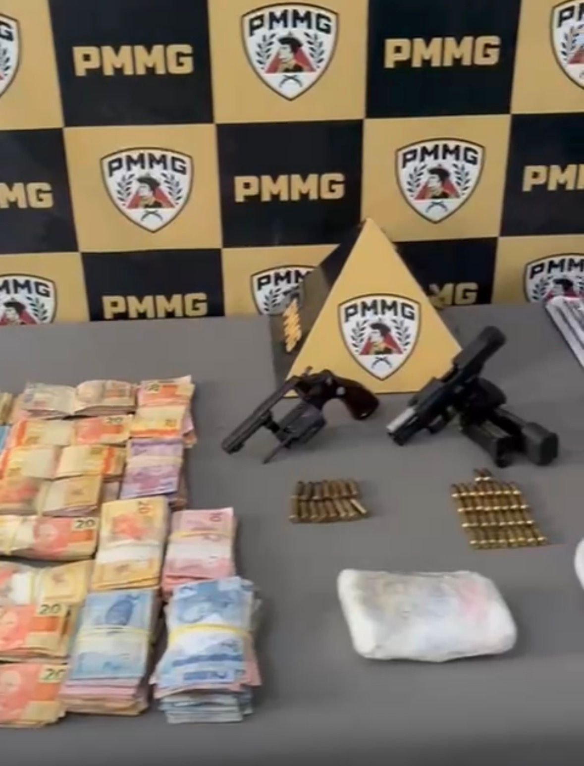 Também foram localizadas duas armas de fogo, sendo um revólver calibre .38 e uma pistola calibre 9mm, acompanhadas de munições e carregadores.