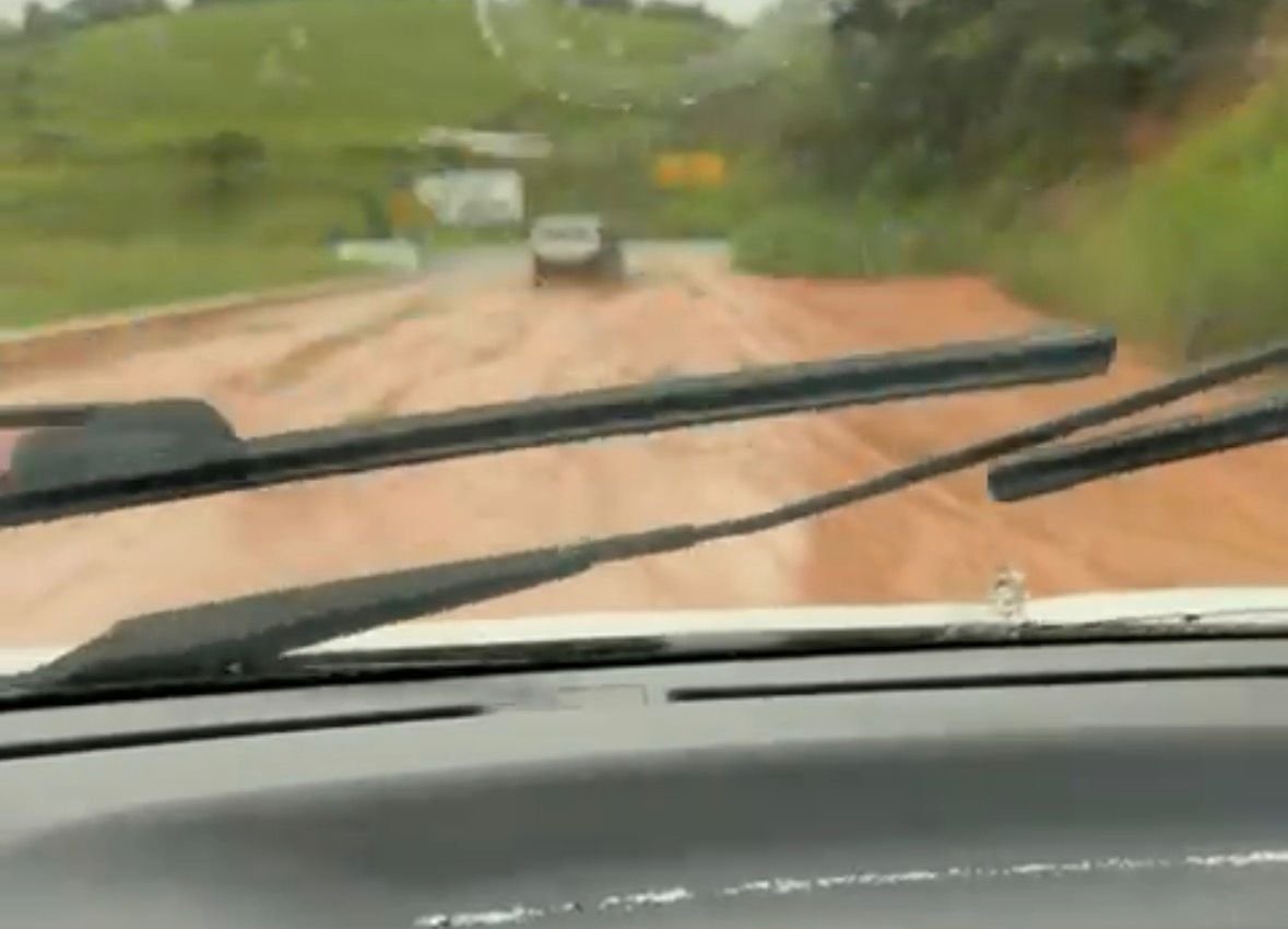 No registro, um motorista alerta outros condutores sobre as condições perigosas da rodovia, principalmente devido à lama espalhada pelo asfalto. O material evidencia que o trecho pode se tornar ainda mais perigoso em períodos de chuva, quando o barro deixa a pista escorregadia e aumenta o risco de derrapagens, perda de controle do veículo e acidentes.